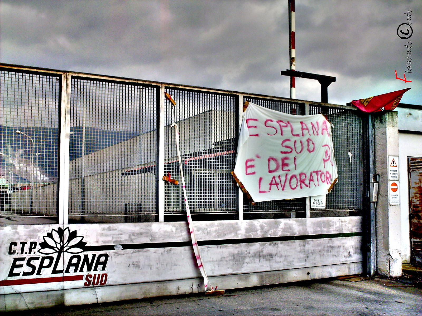 La legna nella stufa-cucina in ghisa continua a riscaldare Ciro, Giorgio, Sergio e Mimmo: sono loro i quattro operai cassintegrati dell’Esplana Sud che trascorreranno questo martedì notte all’interno della sala mensa, quartier generale dei lavoratori indignati e luogo di incontro con autorità, associazioni e giornalisti. I dipendenti dell’ex azienda ortofrutticola in fallimento da alcuni mesi stanno cercando in tutti i modi di smuovere le coscienze e l’interesse della politica e di attori finanziari che riescano a riprendere in mano la situazione dei 120 lavoratori adesso in cassa integrazione, da novembre prossimo senza. Fanno presidi in Regione, protestano a Roma, chiedono udienza agli amministratori del territorio: le commesse c’erano e le promesse di alcuni grandi gruppi di supermercati ancora ci sono. Ma l’occupazione dello stabilimento che stanno strenuamente portando avanti ha dei costi e necessita di continue accortezze. Mimmo, chiamato da tutti “O’ Friscon” per un gioco con la moglie e gli altri operai dell’Esplana, ci mostra l’ultimo espediente ingegnato per risparmiare sui venti euro di benzina necessari al generatore per la luce e la “compagnia” di una vecchia televisione. Si tratta di una batteria per auto collegata ad un trasformatore: in questo modo il generatore ricarica la batteria e nello stesso tempo illumina lo stanzone. La carica della batteria viene poi utilizzata il giorno dopo, risparmiando così la benzina per il generatore.