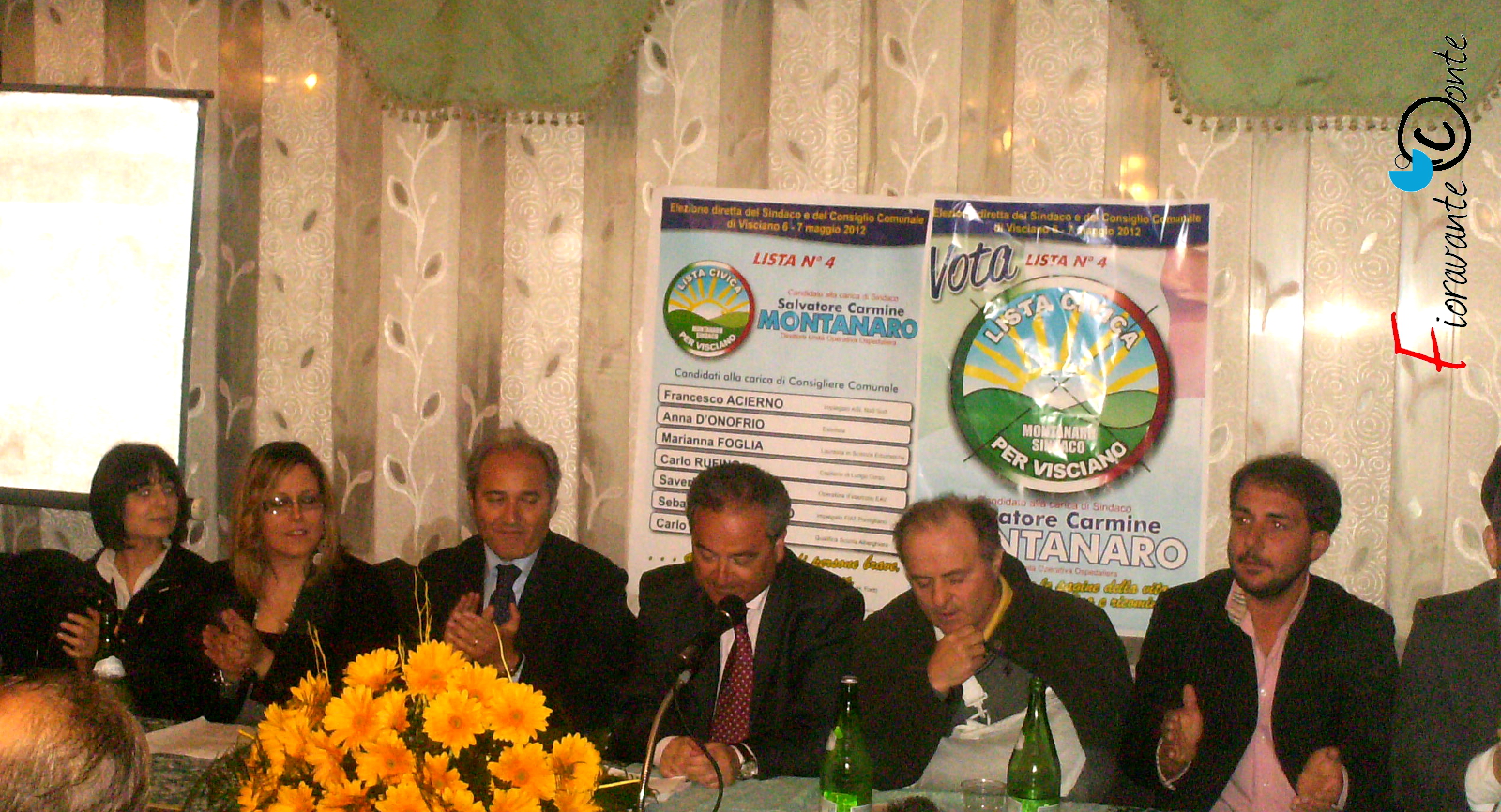 “Vi voglio bene”. Sono queste le tre parole con cui Carmine Montanaro, 56 anni, otorino e professore universitario, candidato a sindaco per Lista Civica per Visciano, è solito concludere le sue arringhe. E’ questo il modo con cui esprime il sentimento autentico di amore per il proprio paese: un forte “vi voglio bene” rivolto a tutti i viscianesi. La location, per via del maltempo, è il salone del Ristorante “Il Campanile”, la stessa in cui, il 13 marzo scorso, il dottor Carmine Montanaro informò Visciano della sua volontà di scendere in campo. In sottofondo, quasi a regalare un consiglio, “Mi fido di te” di Jovanotti che accompagna lo scorrere su di uno schermo delle immagini dei sette candidati della lista numero quattro: parlano emozionati Francesco Acierno, Saverio e Sebastiano Sirignano, Carlo Soviero, Carlo Rufino (presidente del consiglio comunale uscente) e le “quote rosa” Marianna Foglia ed Anna D’Onofrio.