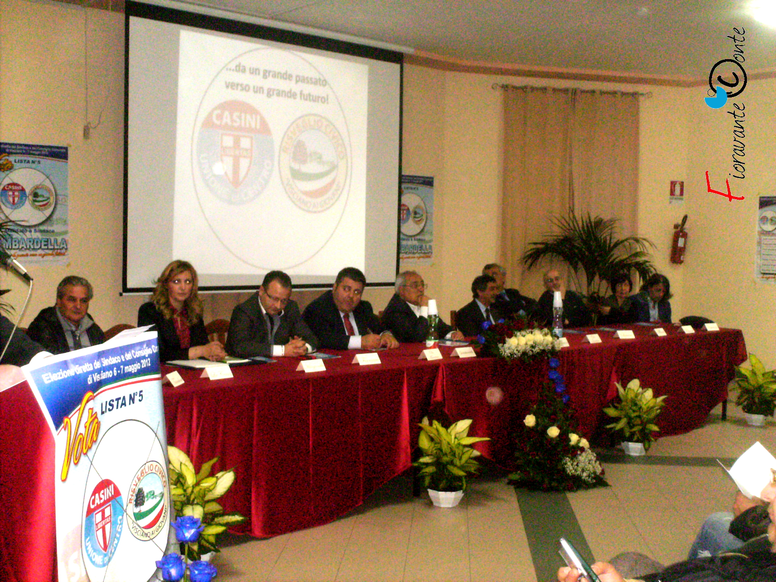 L’atmosfera è elettrica. La sala conferenze dell’Oasi di Maria “addobbata” per le grandi occasioni è completamente gremita. Trecento saranno suppergiù i presenti. Un tavolo coperto da stoffa rossa, confezioni di fiori, opuscoli con il programma/progetto distribuiti all’entrata e schermo che mostra le foto dei candidati nella lista numero 5 “Udc-Risveglio Civico” con il medico-chirurgo Pellegrino Gambardella candidato a sindaco. Il tutto accompagnato dalla musica: “Centro di gravità permanente” di Battiato prima, “L’amico è” di Dario Baldan Bembo poi. I candidati per la tornata del 6 e 7 maggio vengono presentati attraverso schede personali complete di dettagli quali età, professione e famiglia. Più volte la parola “vittoria” viene esclamata a gran voce dai candidati, in un andamento bustrofedico che vede alternarsi esponenti dell’Udc ed amici di Risveglio Civico. La lista numero 5 infatti nasce da un accordo improvviso ed inaspettato di Gambardella con Soviero, che fino a qualche giorno prima della presentazione delle liste si mostrava motivato e deciso a scendere in campo con una sua formazione.