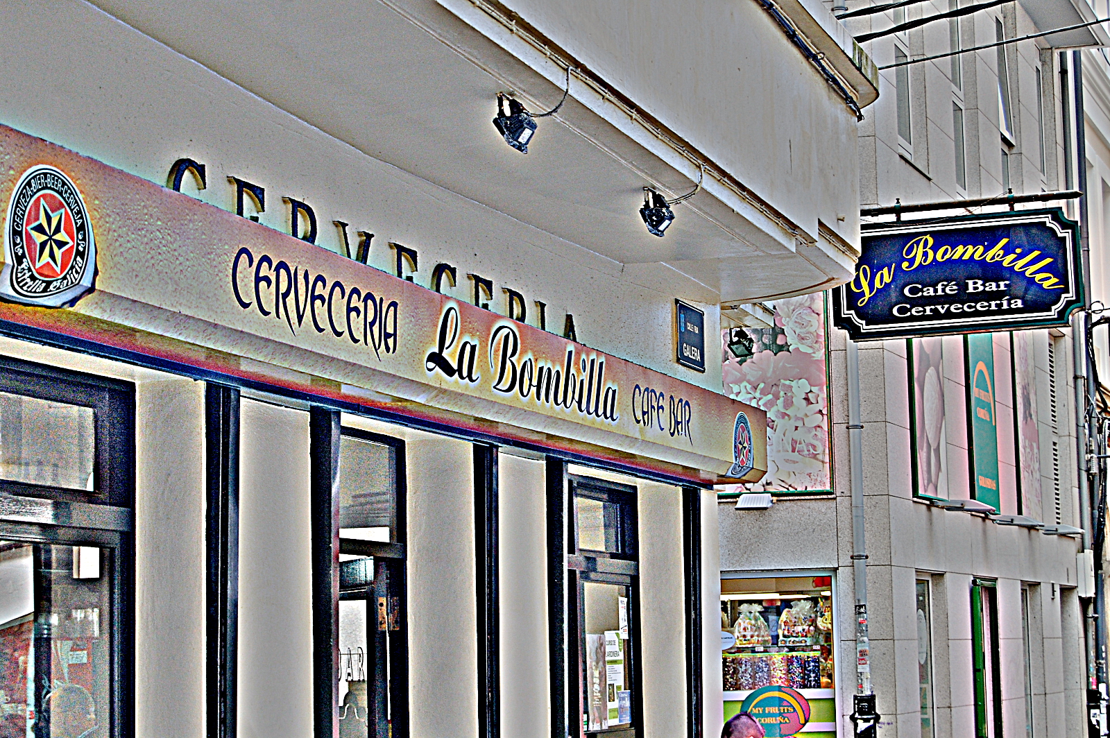 “Mi piacciono le peripatetiche che gli sono intorno”! Benvenuto a La Coruña. È l’ora di pranzo, un gruppo di ragazzi del posto, un manipolo di turisti, alcuni barboni. La Bombilla in Rúa da Galera è strapiena, “come ogni giorno”, mi dice una signora in chiaro accento galiziano, una delle quattro lingue nazionali spagnole, a metà tra castigliano e portoghese. Mi piomba d’improvviso in testa la frase in galiziano vista e rivista tante volte su di un muro al Campus Norte dell’Università di Santiago de Compostela, tra la Facoltà di Economia e quella di Filologia: “O galego, ou è galego-portugues ou è galego-castelhano” (Il galiziano o è galiziano-portoghese o galiziano-castigliano).